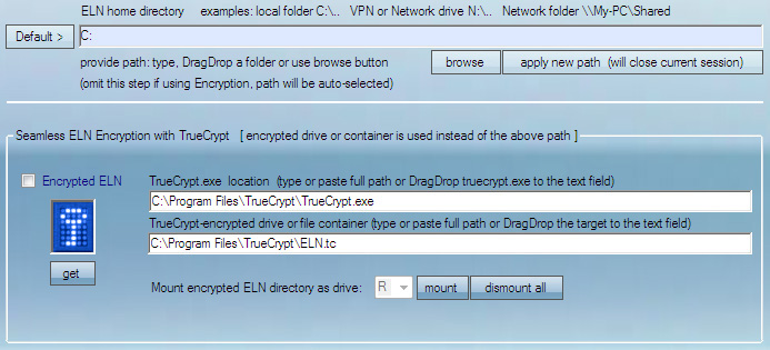 (1) TrueCrypt must be installed on the computer. Full path to Truecrypt.exe should be provided in the Directories and Encryption menu. (2) Encrypted container should be created using TrueCrypt. Full path to the encrypted container should be provided in the Directories and Encryption menu. (3) Encrypted ELN option must be checked in Directories and Encryption. (4) ELN mounting drive letter should be chosen in Directories and Encryption.