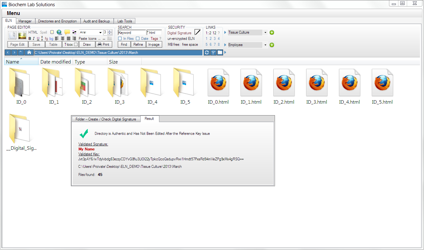 "Was this sentence here on December 17, 2008 ? Or was it edited in yesterday ?" With digital documents, it is easy to do editing without a trace. If this question cannot be answered with a solid proof, ELN records lose value as a trusted documentation instrument. BiochemLabSolutions ELN integrates a simple and effective audit method to prove that every record, every comma and every byte in ELN project or in entire ELN is original and was not modified after the date of signing. The digital signatures used are cryptographically strong (asymmetric equivalent of 512 bit) and once issued, cannot be compromised or bypassed. Digital signatures can be created automatically on a schedule. You don't need to be a security expert to use or interpret them.