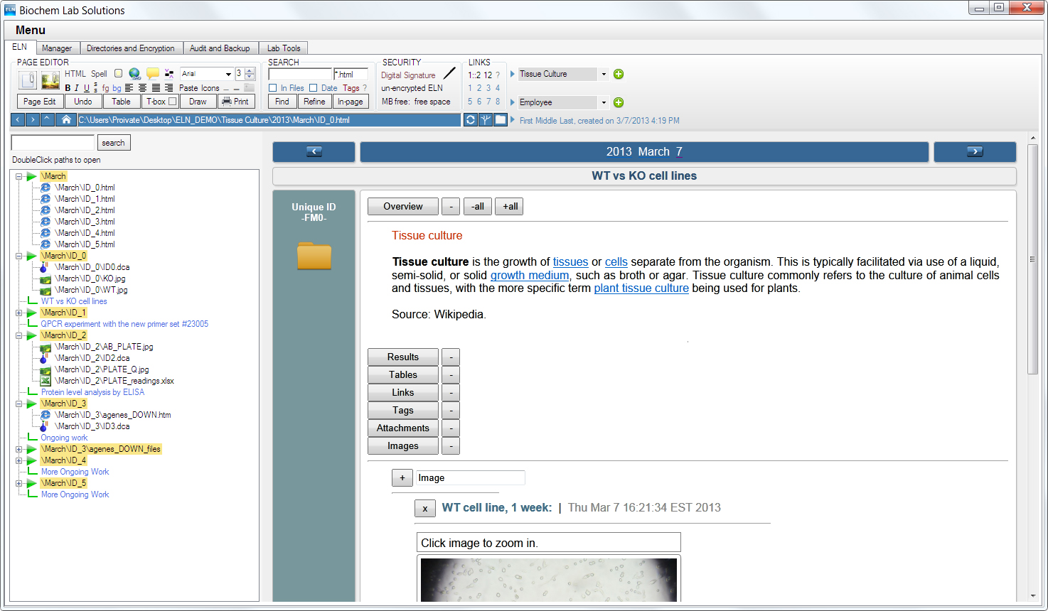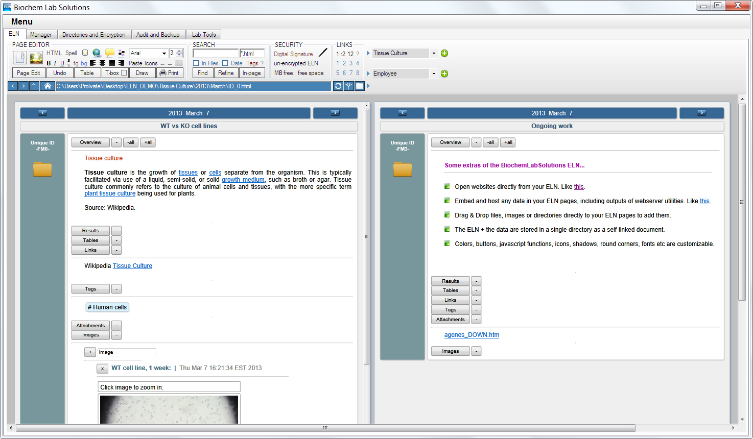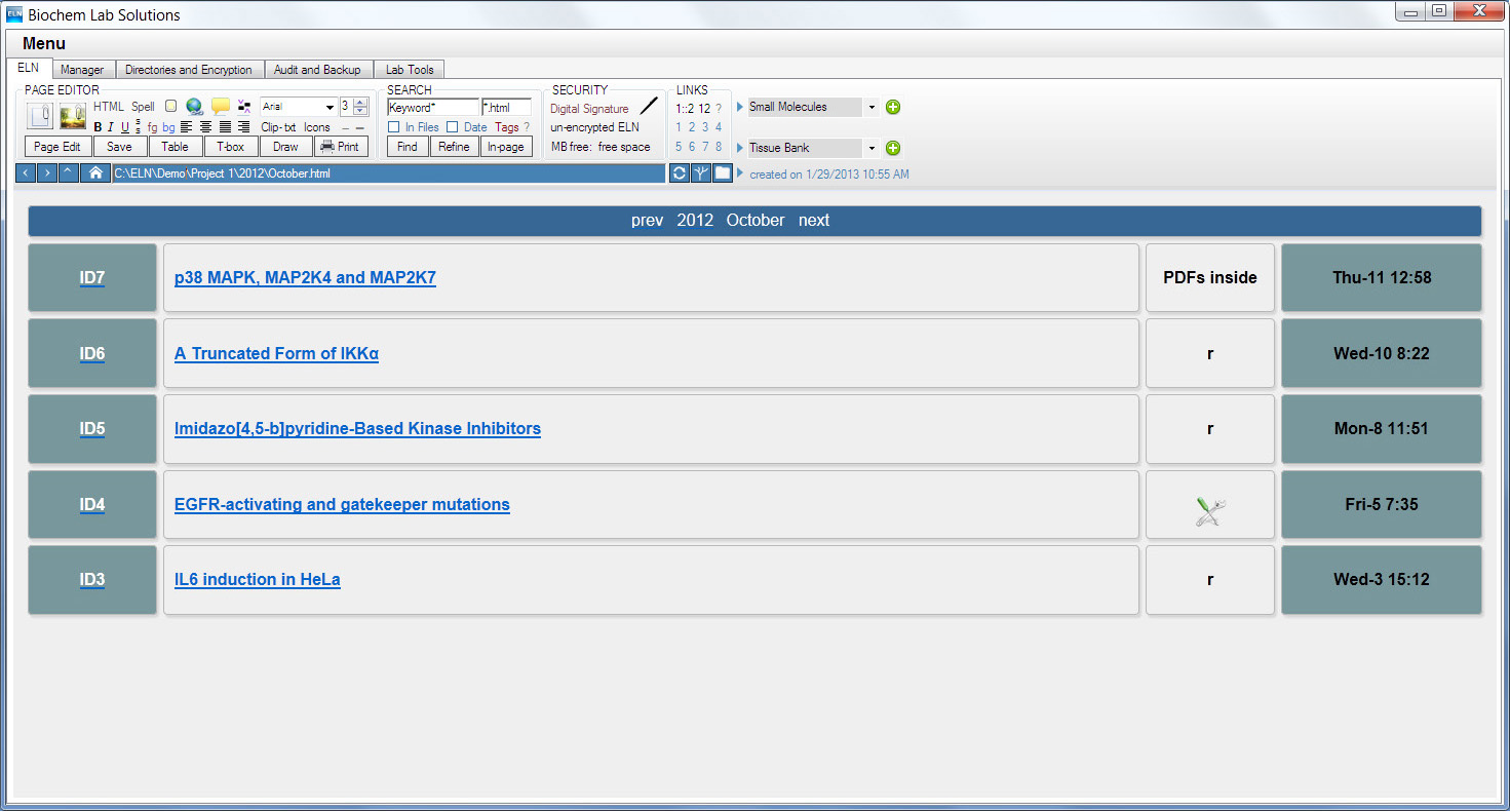 BiochemLabSolutions ELN is a powerful data manager. The ELN stores all notebook records and all data files relevant to each ELN page. Opening ELN pages brings to view all the associated data to ensure a convenient way of storing and managing digital lab resources. All files are digitally sgned along with the ELN records.