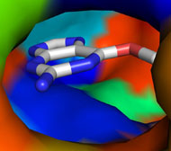 Surface colored by per-atom solvation energy. Note the red "hot spot".