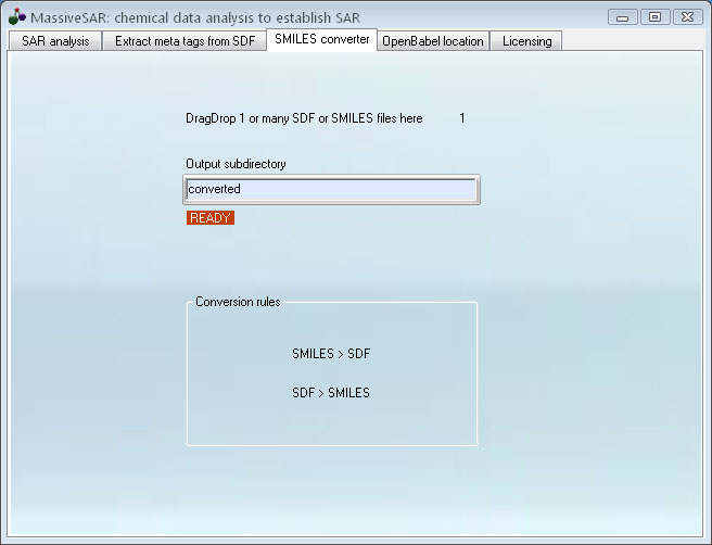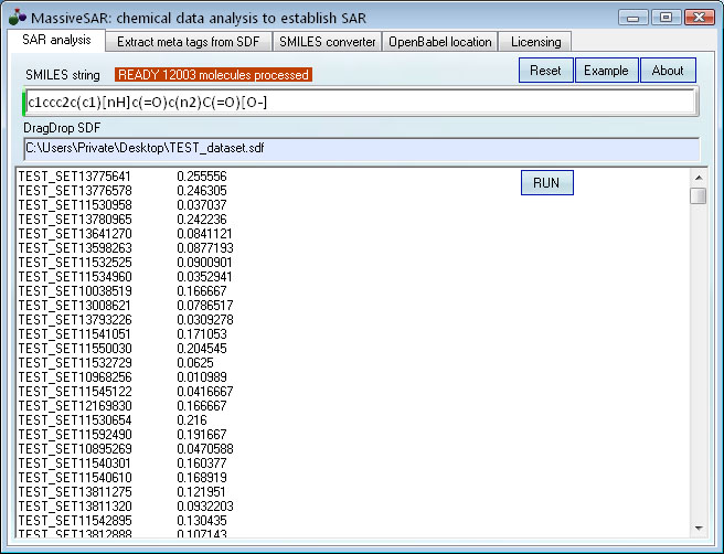 MassiveSAR provides a simple way for finding structurally similar or structurally related molecules in chemical data sets. For example, when conducting high-throughput screens, it may be important to find molecules within 80% of structural similarity to a certain good hit. This could be used to find out which molecules look similar and work well and which molecules look similar and do not work - to establish structure-activity relationships, SAR.