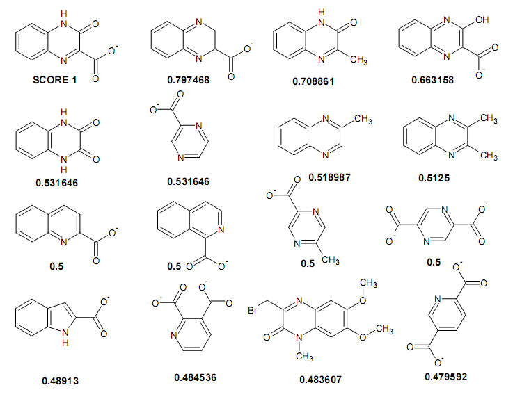 To view structures, one could use JChem or ChemSketch (use Shift+Ctrl+U to paste SMILES strings directly to ChemSketch). First 16 most query-like molecules (out of total of 12,004 molecules analyzed) are shown: